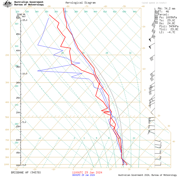 A weather balloon measured record high water vapour levels on Monday evening at Brisbane Airport, with precipitable water values measuring 74.2mm, breaking the previous record of 70.9mm back in March 2017. This contributed to torrential rainfall and flooding just north of the city that evening, with some areas seeing totals in excess of 300mm.